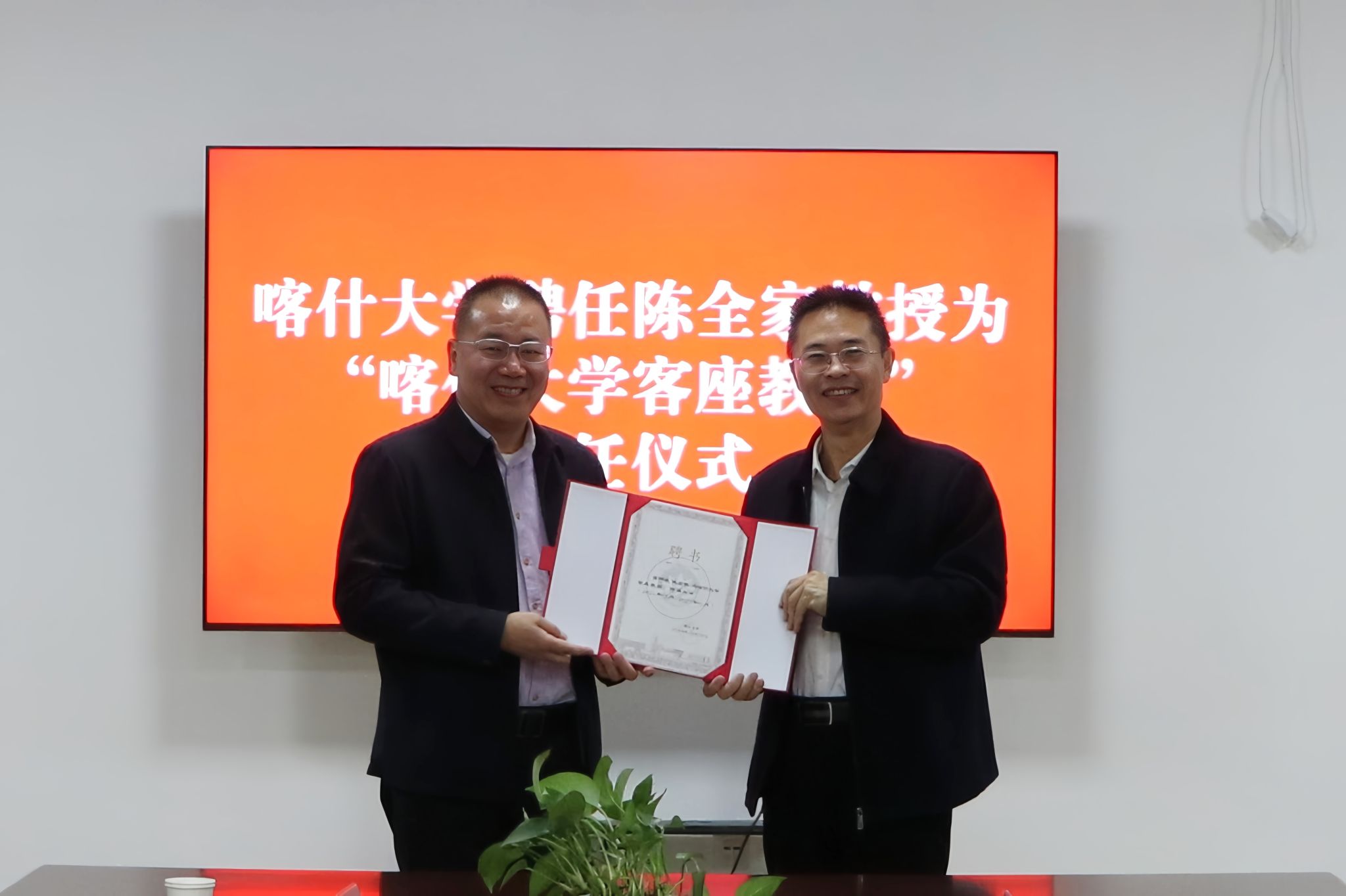 座谈会期间,党委常委、副校长罗浩波为陈全家院长颁发了“喀什大学客座教授”聘书。