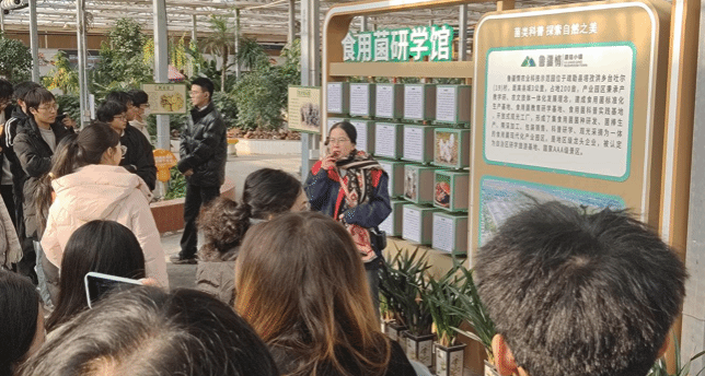 随后,现代农学院师生抵达疏勒县鲁疆情蘑菇小镇,沉浸式体验智慧食用菌产业的发展成果。在智慧菇仓内,师生们目睹了5G数字化调控系统的精准运作——通过智能终端实时监测并调控 18-20℃的恒温生长环境,实现银耳等菌类的立体化高效种植,每个100平方米的智慧菇仓可一次性培育4500-5000个菌棒,年种五茬,经济效益突出。技术人员详细讲解了利用本地红枣加工副产物改良菌棒基质的创新工艺,以及菌种研发、菌棒生产、精深加工、科普研学一体化的全产业链发展模式,让师生们深刻感受到“科技+本地化资源”赋能特色农业的强大动力。