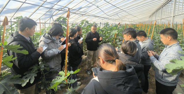 次日,实践队伍前往疏勒县郭牌西瓜种植基地,围绕高端设施瓜果种植的核心岗位开展实践。基地根据学生专业方向,分配了温室管理、田间栽培、产品溯源三个实操岗位。温室管理岗位上,学生学习了冬暖式日光温室的环境调控技术,包括冬季光照补光、昼夜温差调控、通风降湿等关键操作,掌握了智能温控设备、滴灌系统的日常巡检与故障排查方法;田间栽培岗位中,在技术人员指导下,同学们开展了西瓜吊蔓整枝、疏花疏果、病虫害绿色防控等实操工作,熟练运用了嫁接苗定植、水肥精准施用等核心技术,理解了“一蔓一瓜”精细化管理对提升西瓜品质的重要意义;产品溯源岗位上,学生参与了西瓜生长档案记录、溯源二维码生成与绑定等工作,学习了从种植到采收的全流程溯源体系建设方法,认识到品牌化、标准化对特色农产品市场竞争力的提升作用。此外,基地负责人还分享了“科研+企业+农户”的产业运营模式,让学生对设施农业的规模化种植、品牌化运营有了更全面的理解。