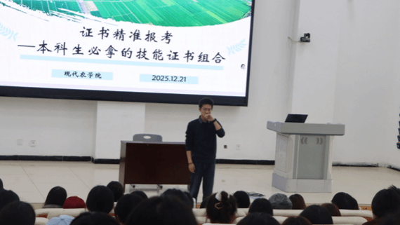 为破解农学本科生盲目考证困境,助力学生精准对接就业市场需求,2025年12月21日,现代农学院辅导员马海涛老师面向全体本科生开展“证书精准报考——本科生必拿的技能证书组合”主题讲座,为学生量身定制科学考证与职业发展方案。
